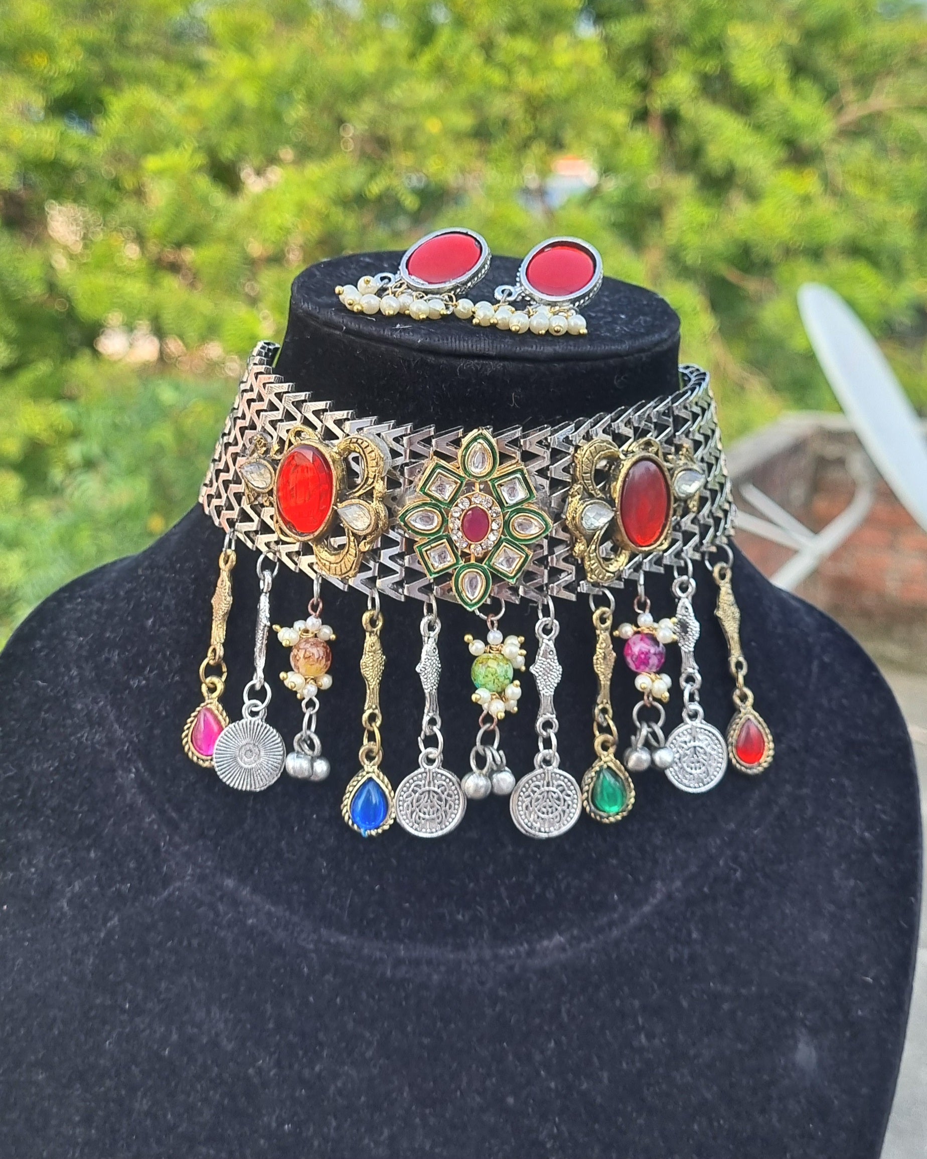 All our jewellery pieces are made in pure brass and oxidised mentioned in product description using materials like high quality monalisha stone, crystal beads ,real glass, original pachi kundan.