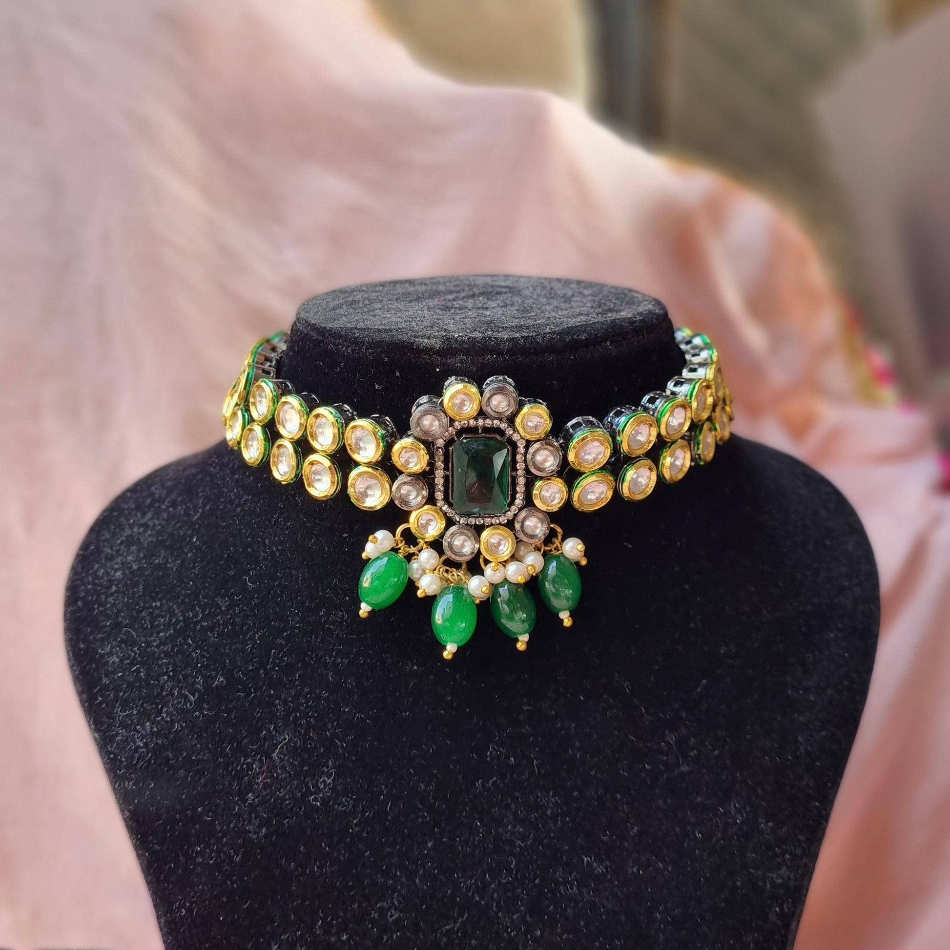 All our jewellery pieces are made in pure brass and oxidised mentioned in product description using materials like high quality monalisha stone, crystal beads ,real glass, original pachi kundan.